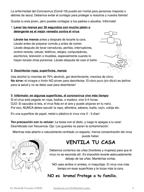 * NUNCA sacudan ropa usada o sin usar, ni sabanas ni nada de tela. Mientras pegado a superficie porosa, es muy inerte y se desintegra solo entre 3 horas (tela y porosos), 4 horas (cobre, porque es naturalmente antiséptico; y madera, porque le quita toda la humedad y no lo deja despegar y se desintegra), 24 horas (cartón), 42 horas (metal) y 72 horas (plástico). Pero si lo sacuden o usan plumero, las moléculas del virus flotan en el aire activas hasta por 3 horas, y pueden alojarse en la nariz.