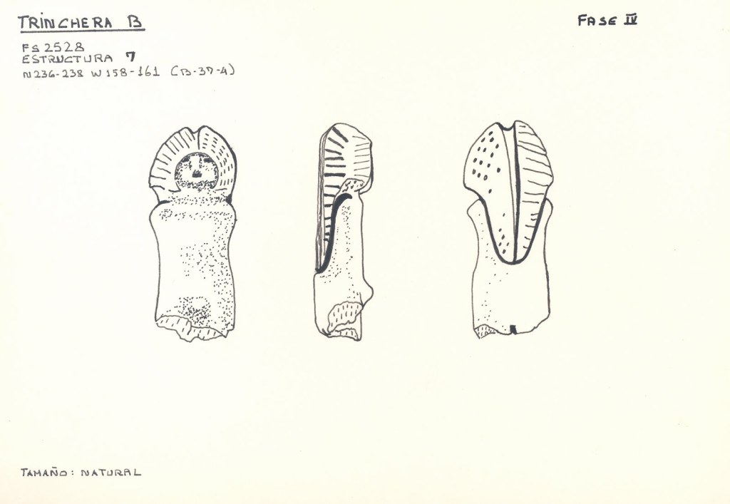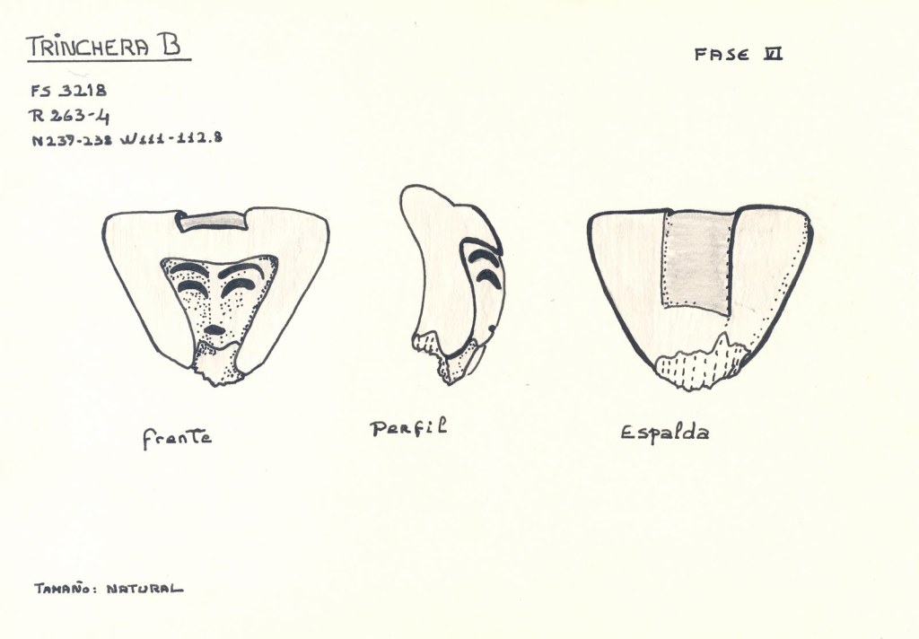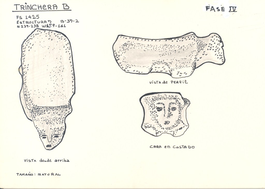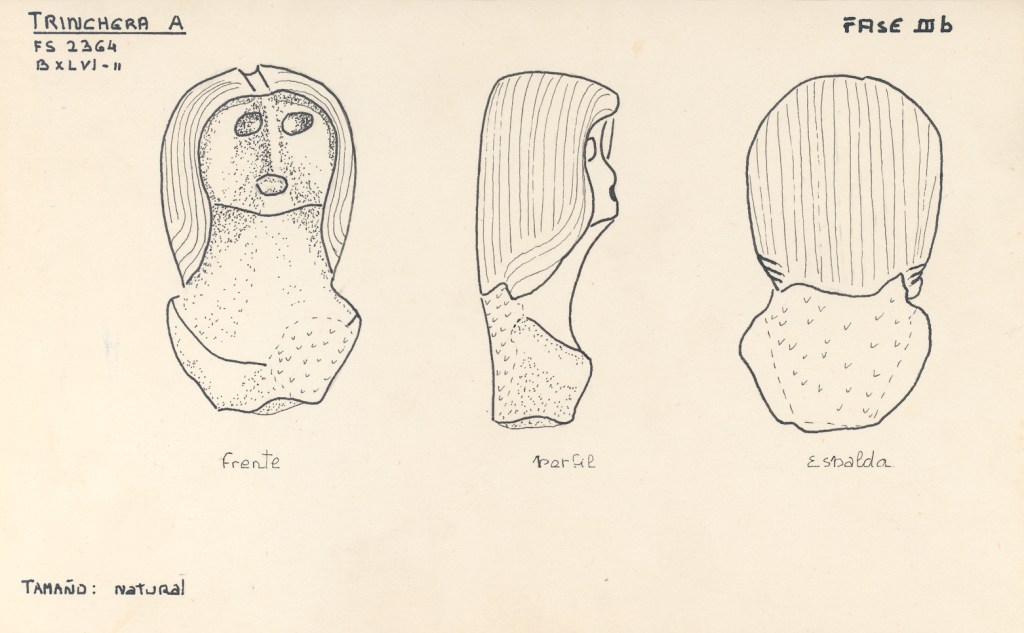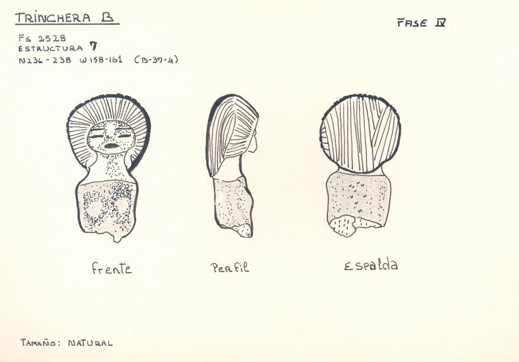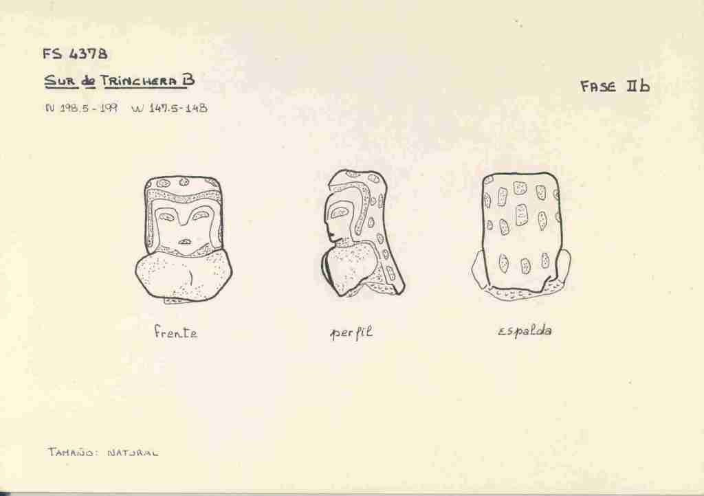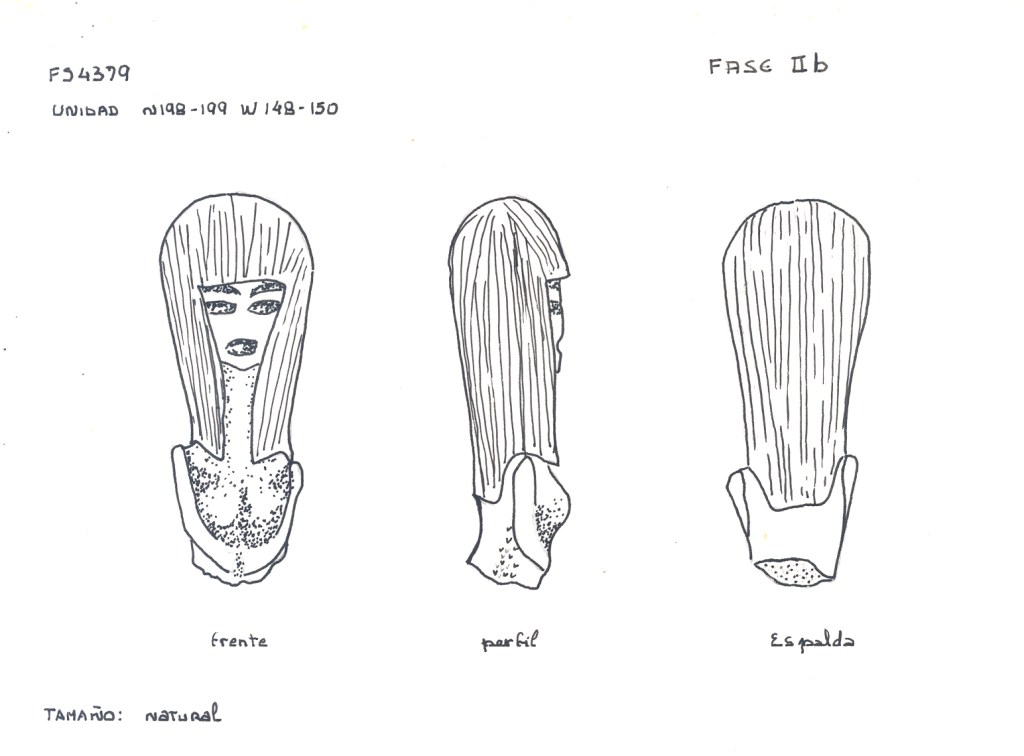 Las figurillas son muy decoradas y se aprecia la deformación craneana que empieza a aparecer en los entierros de la fase Valdivia VII (Munizaga 1965) (García Caputi, 2006).