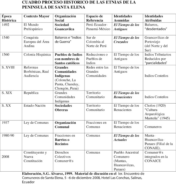 Mirado desde la construcción social del espacio es posible distinguir cuatro fases. La primera sería la Pre-colonial caracterizada por las singularidades que presenta la sociedad “Goancavillca”. Esta ocupa un territorio que se extiende más allá de los límites físicos de su “área cultural”. Sus fronteras se prolongan mediadas por las relaciones de intercambio a larga distancia con la zona mesoamericana y andina-central. Esta fase transita hacia su descomposición desde el momento en que la invasión española y ocupación colonial cortan las antiguas redes de intercambio y las sustituyen de acuerdo a sus necesidades mercantiles. La sociedad “Goancavillca” demuestra, no obstante, una ágil capacidad para recomponer sus conexiones e insertarse en los nuevos circuitos del poder mercantil. Comienza así la segunda fase de las Encomiendas y Reducciones, con la caída abrupta de la población, la concentración en “pueblos de indios” y la delimitación de un dominio político territorial impuesta por el estado colonial. En una tercera fase, la de las “Grandes Comunidades Étnicas”, la población no solo logra recuperarse demográfica y económicamente, sino que recrea un territorio étnico distinto y contrapuesto al español. Este inmenso espacio geográfico se reproduce de forma políticamente autónoma durante parte de la colonia, la constitución de la república, hasta la formación del actual Estado-nación. Finalmente en la última y cuarta fase de las Comunas el territorio se fracciona como fórmula política para frenar su desintegración y mantener su “autonomía histórica”. Esta fase conduce en las actuales reclamaciones políticas a un reencuentro de identidad con el movimiento indígena nacional. La periodización histórica asociada a cambios de espacio y formulas de identidad se relata en la tradición oral como el “Tiempo de los Antiguos”, el “Tiempo de los Renacientes” y el “Tiempo de los Actuales”.